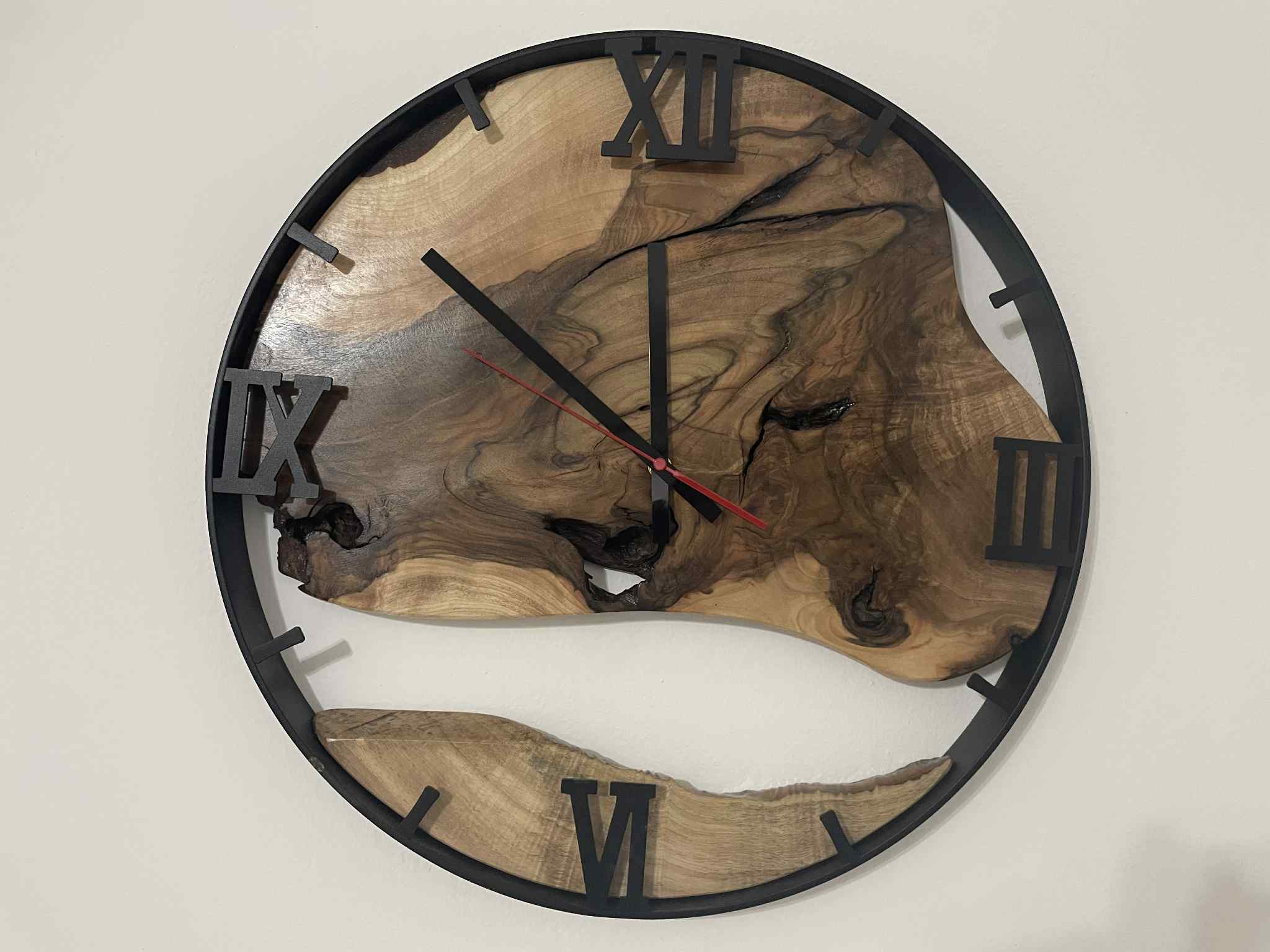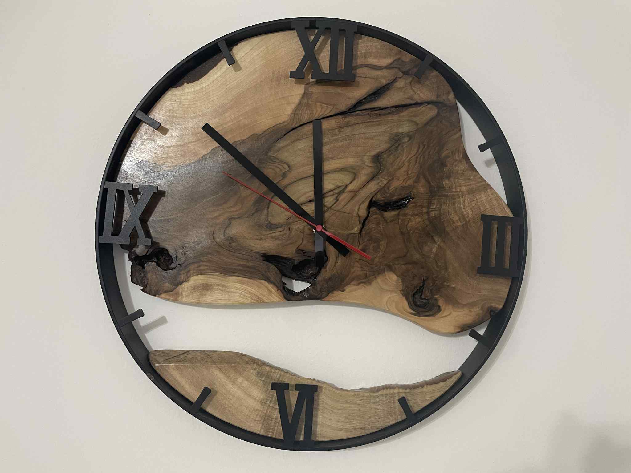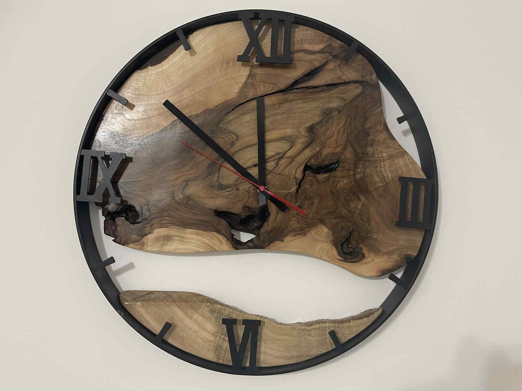 Štýlové nástenné drevené hodiny z orechového dreva vhodné na chalupu, do kuchyne, obývačky alebo pracovne. Hodiny nemusia byť pre vás len ukazovateľom času, ale aj kúskom prírody vo vašej domácnosti. Rozmer: priemer kruhu 50 cm.Materiál : Orechové drevo ,kovová obruč.