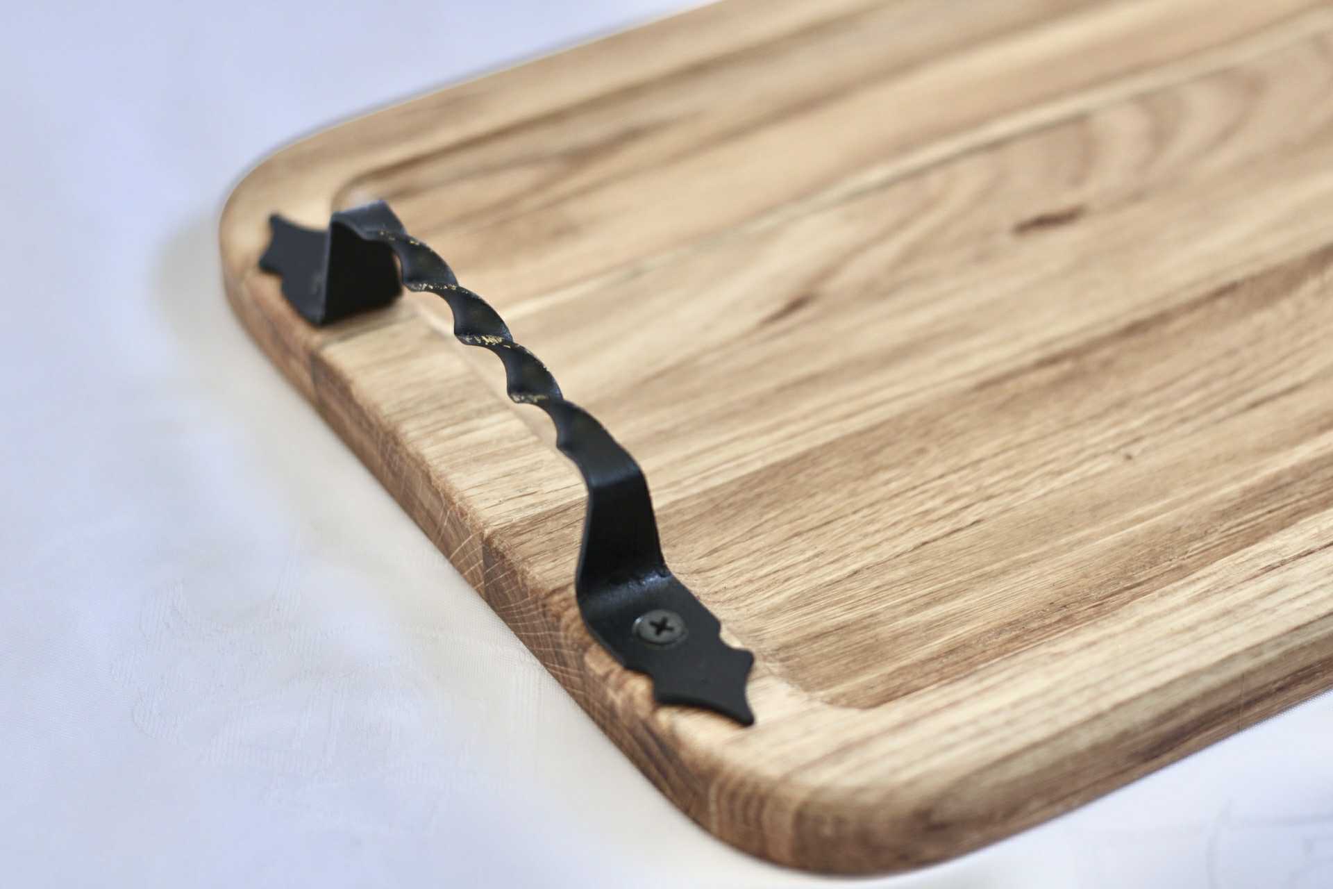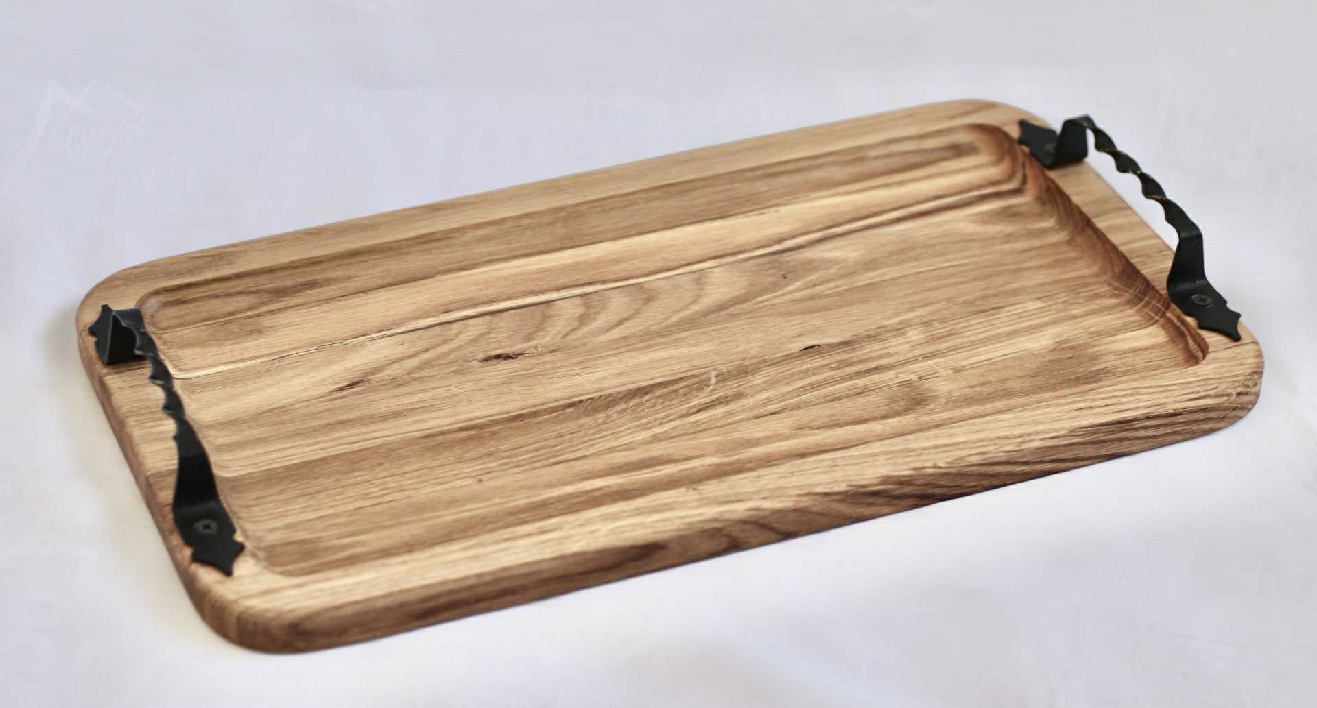 Drevený podnos s kovovými rúčkami z orechového dreva na podávanie rôznych druhov občerstvenia, syrov a údenín. Vďaka kontrastným čiernym kovovým rúčkam získava podnos modrený vzhľad. Rozmer: 45 x 25 cm,výška 2 cm