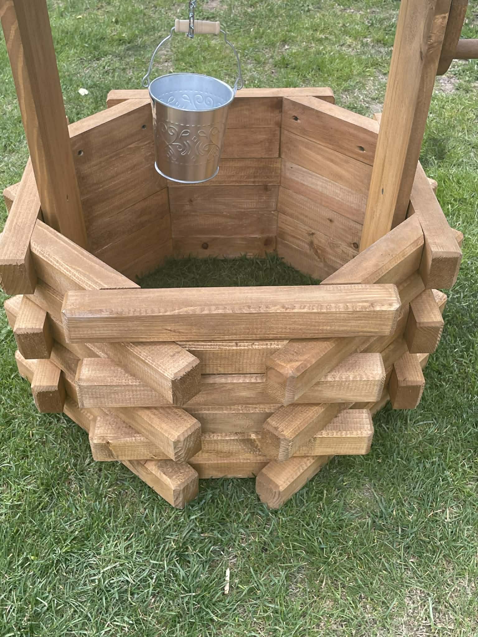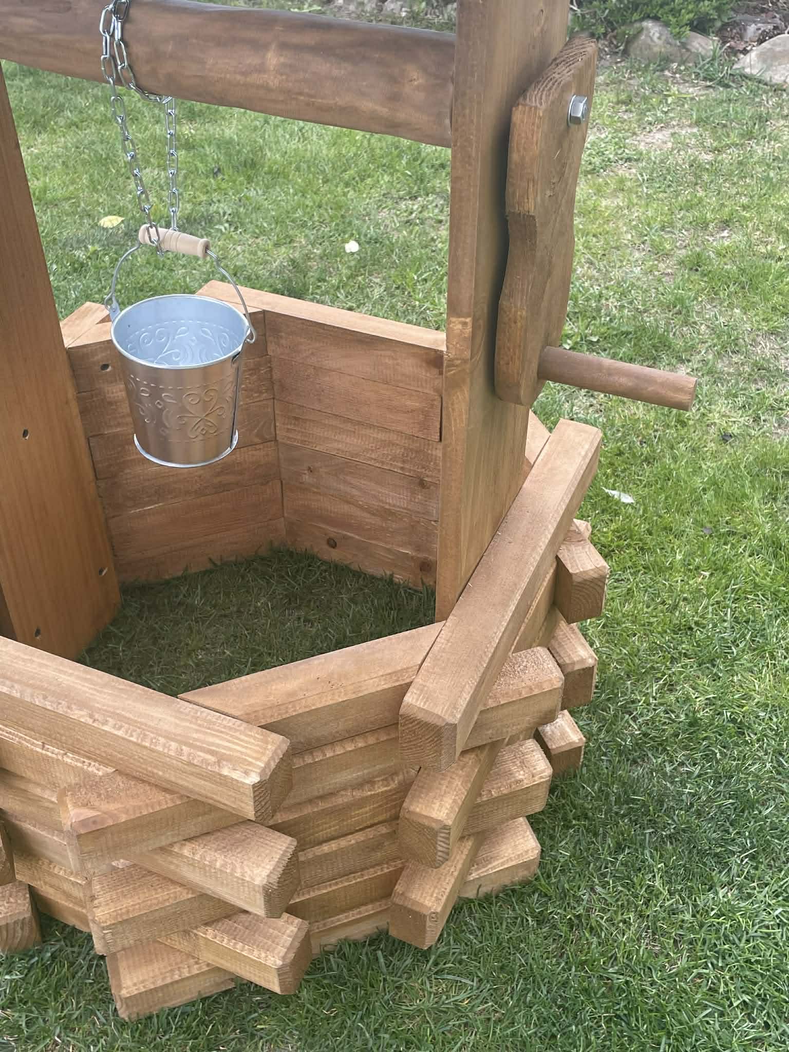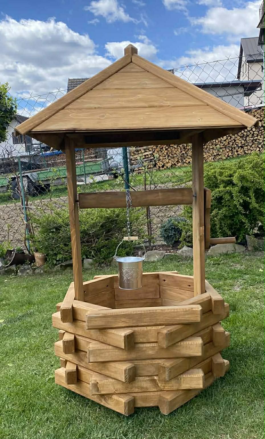 Drevená dekoratívna studňa – symbol tradičnej krásy vo vašej záhrade Nechajte svoju záhradu ožiť s touto originálnou drevenou studňou, ktorá vám prinesie nádych prírodnej krásy. Materiál: Smrekové drevo.Drevená dekoratívna studňa morená. Rozmer výška studne cca 120 cm, strecha 66x66 cm, spod. priemer 53x53 cm