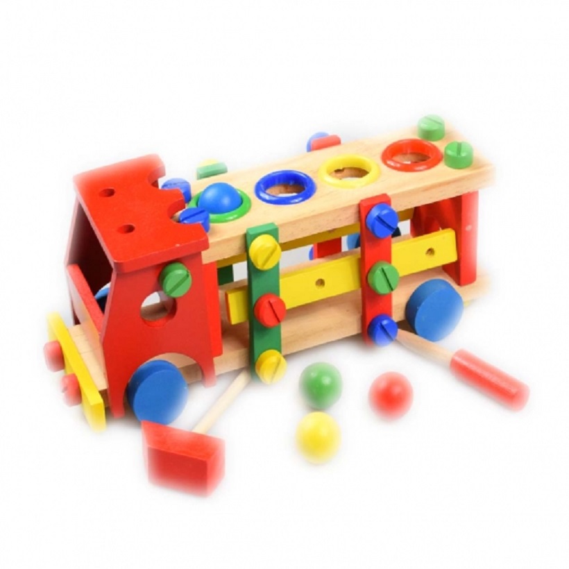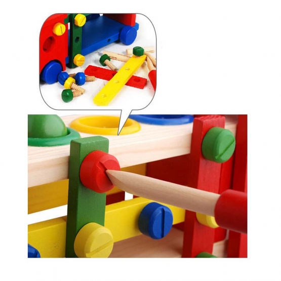 Detské drevené autíčko na skrutkovanie nadchne každého malého kutila! Tieto drevené hračka rozvíja pohybovú koordináciu, manuálna zručnosť, kreativitu dieťaťa a tiež spoznávaní farieb a tvarov. Sada autíčka z dreva obsahuje: - kladivo - skrutkovač - 4 farebné guľôčky - 28 skrutiek - 7 rôznofarebných klád - 4 kolesá - kabínu - podlahu - strechu s dierkami na triedenie guličiek Všetky skrutky možno odskrutkovať skrutkovačom. Dieťa si tak môže celú hračku samo rozobrať na časti. Vďaka farebným otvorom na streche sa dieťa učí rozoznávať farby. Detské farebné autíčko je vyrobené z kvalitného dreva. Rozmery autíčka:Dlžka 30 cm Šírka:12 cm Výška:12 cm