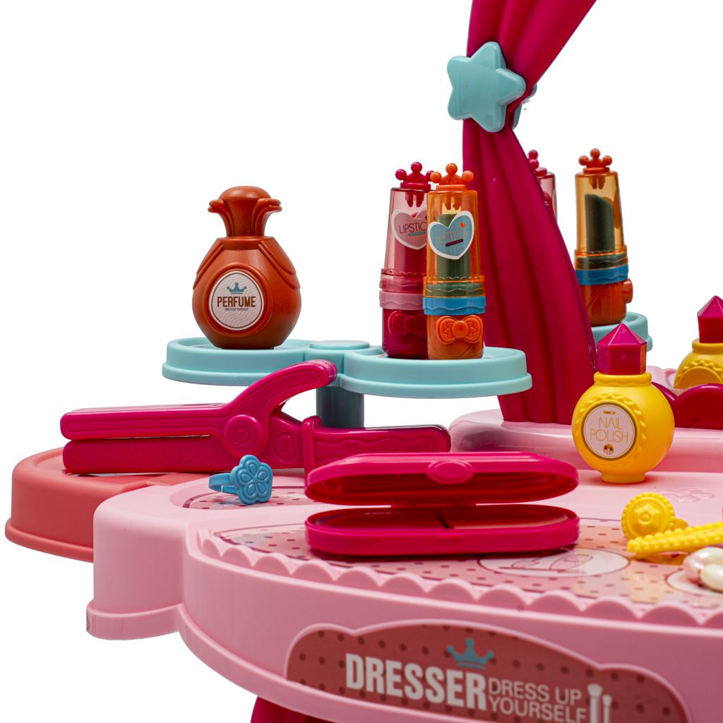 Detský kozmetický stolík je určený pre deti od 3 rokov. Toaletný stolík má zvukové efekty, dodáva sa s kozmetickými modelmi a obsahuje stoličku. Rozmery: -Sedadlo toaletky: 57 x 29 x 69,cm -obal: 45,5 x 10 x 59