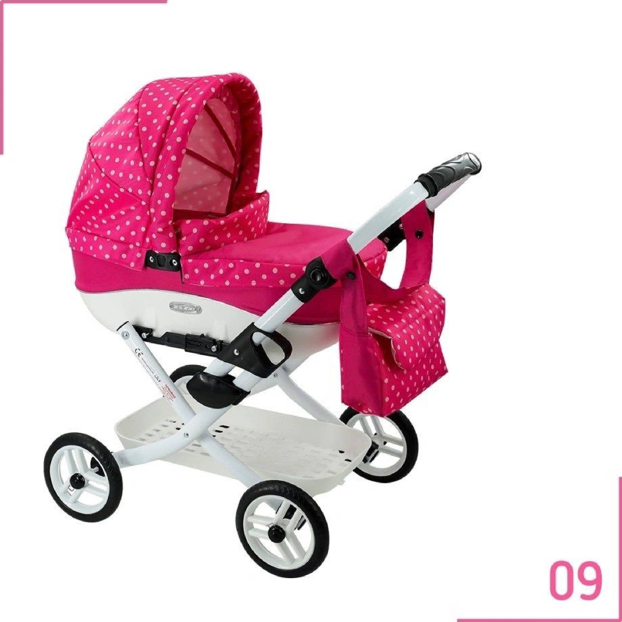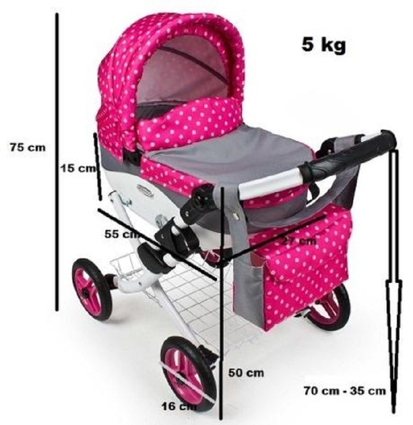 Krásny detský kočík pre bábiky. - stabilná a krásna konštrukcia kočíka, - jednoduchý systém zloženia, - výškovo nastaviteľná rukoväť, - ľahké, penové kolieska, - nákupný kôš pod kočíkom, - plastová koženková vanička s možnosťou odopnutia z konštrukcie, - sklopná strieška, - nánožník so zapínaním na magnet, - mäkký matrac, - príručná taška s popruhom na rameno. Váha: 5,2 kg Rozmer po zložení (Š/D/V): 0,45/0,60/0,25 m) Rozmery po rozložení: Šírka: 45 cm Dĺžka: 75 cm Výška: 75 cm Výška konštrukcie s kolesami: 37 cm Výška vaničky: 38 cm