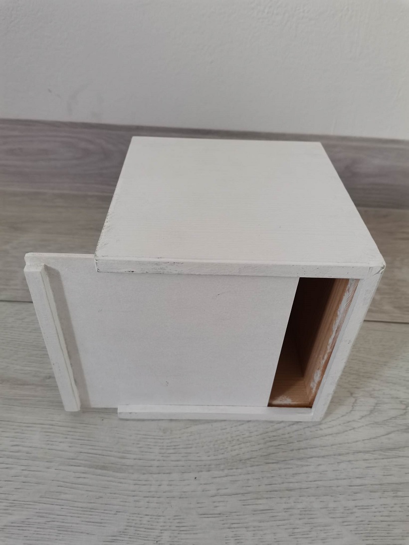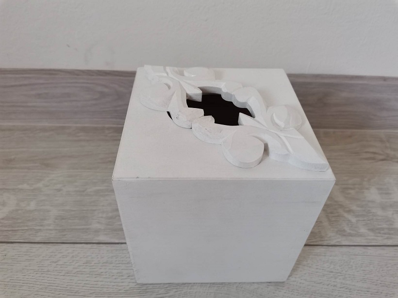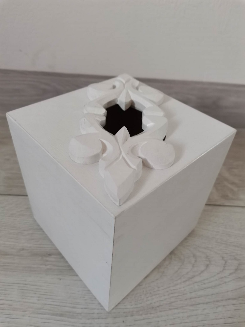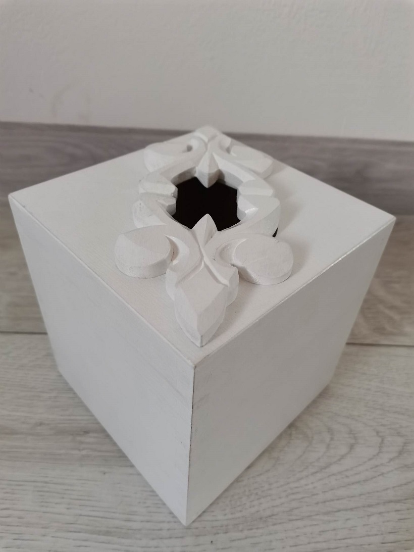 Drevený stojan na servítky- na vrchu okrášlený ľudovým motívom..Drevená krabica je zo spodu otvárateĺná . Morená bielou ekologickou farbou. Rozmer D 13 cm,Š 13 cm, V 14 cm