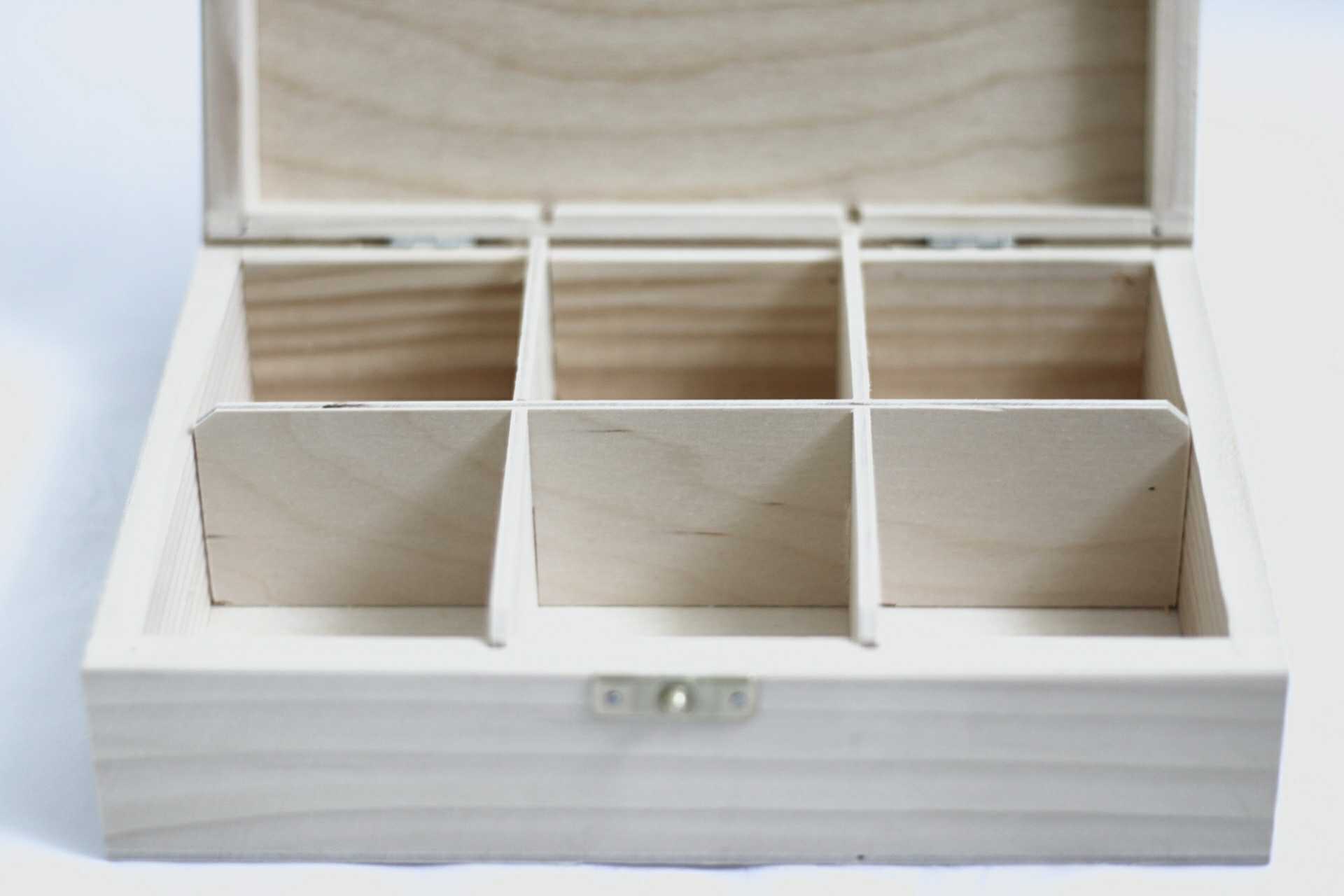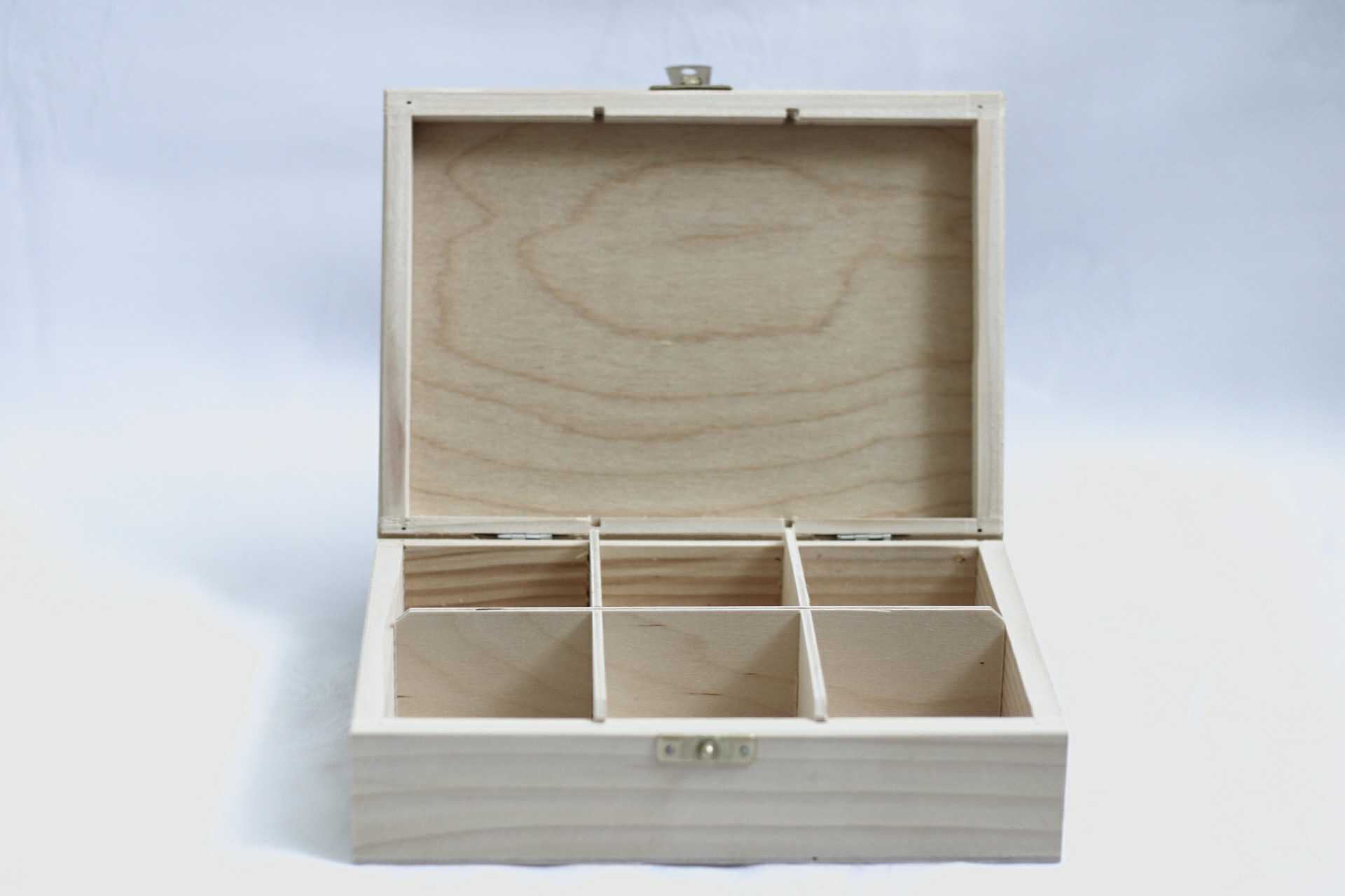 Krabička je vyrobená z borovicového dreva a má 6 priehradiek, takže je dostatočne priestranná, aby sa do nej uložili čajové vrecúška.Krabička je v prírodnej farbe -možete si ju ľubovolne namalovať. Rozmer priehradky:7 x 6,5 cm Rozmer krabičky : D 22 cm Š 16 cm V 7 cm
