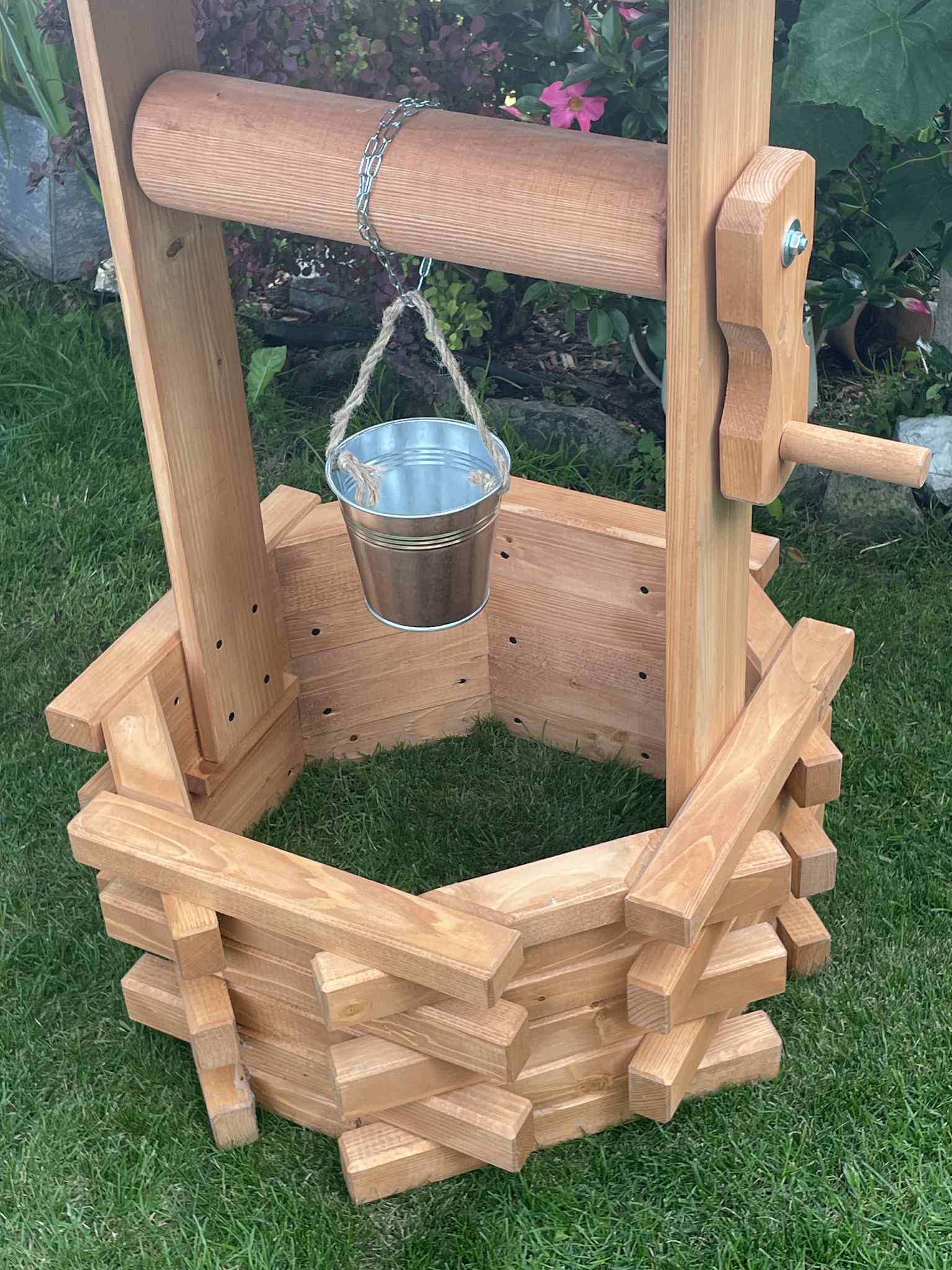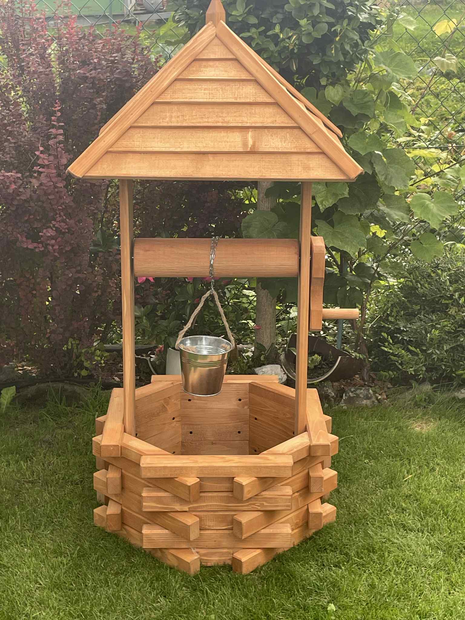 Drevená dekoratívna studňa – symbol tradičnej krásy vo vašej záhrade Nechajte svoju záhradu ožiť s touto originálnou drevenou studňou, ktorá vám prinesie nádych prírodnej krásy. Rozmery Priemer podstavy: 66 cm,Výška podstavy 29 cm, .Priemer strechy: 66 cm Celková výška : 130cm .Materiál: Smrekové drevo.