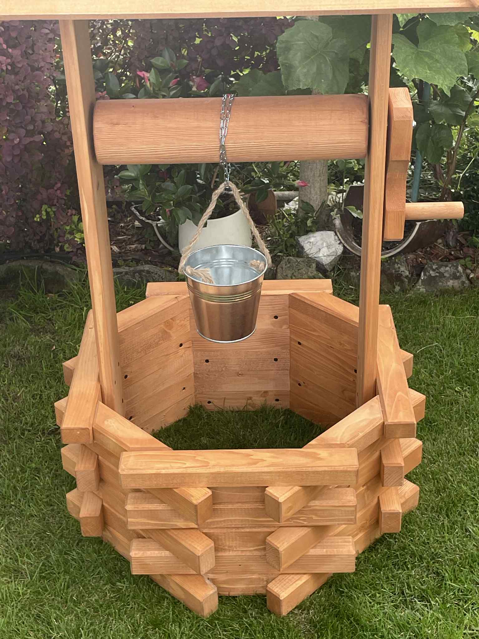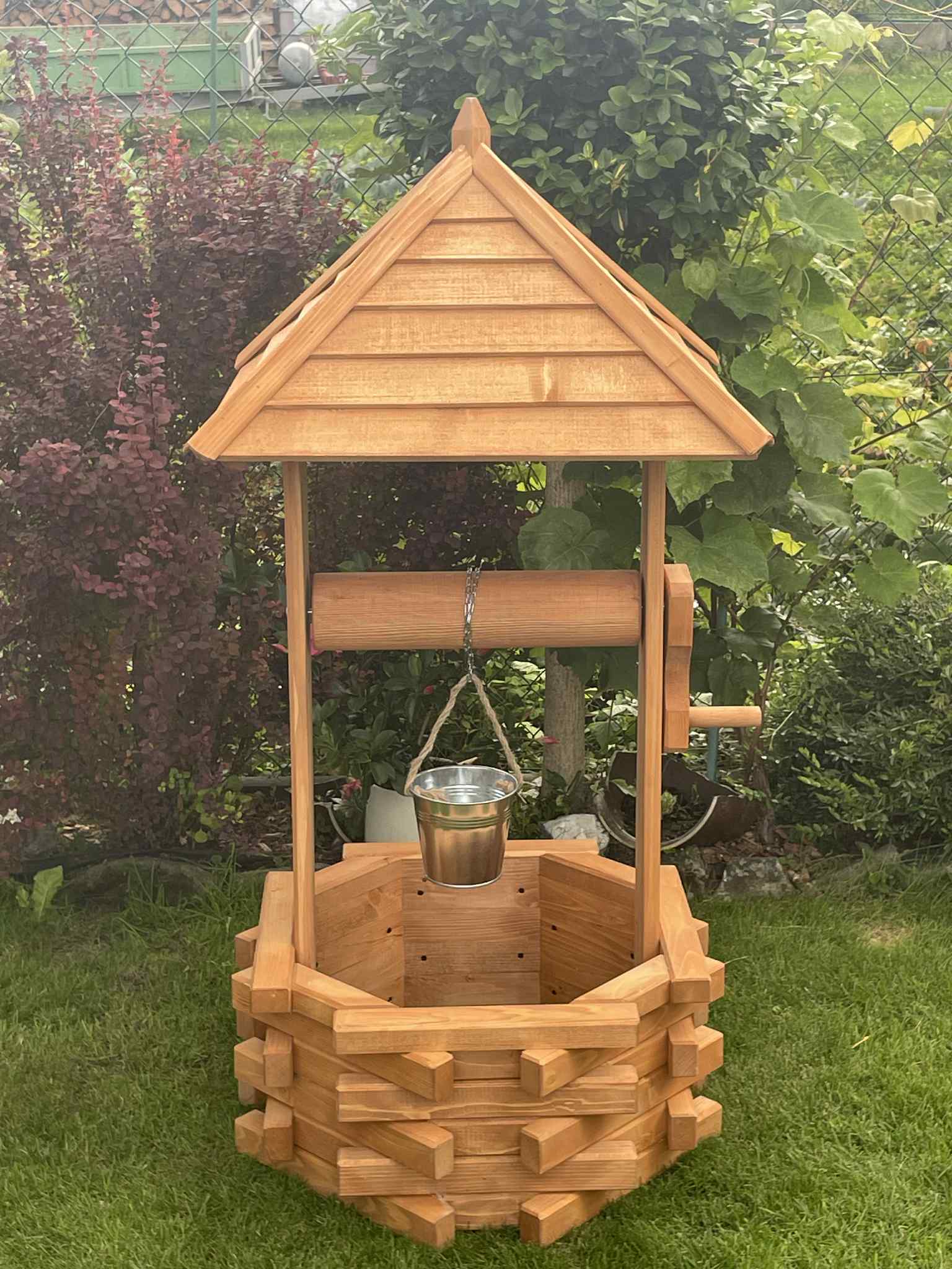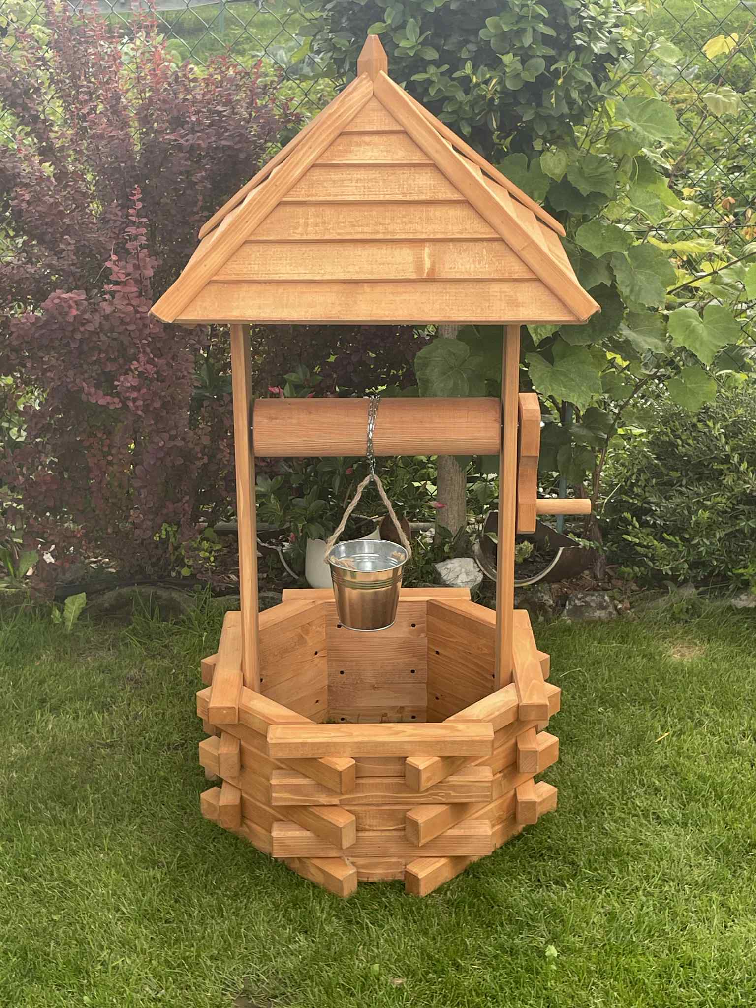 Drevená dekoratívna studňa – symbol tradičnej krásy vo vašej záhrade Nechajte svoju záhradu ožiť s touto originálnou drevenou studňou, ktorá vám prinesie nádych prírodnej krásy. Materiál: Smrekové drevo.Drevená dekoratívna studňa morená.Rozmer výška studne cca 150 cm, strecha 66x66 cm, spodný priemer 66 x 66 cm,výška podstavy 34 cm.