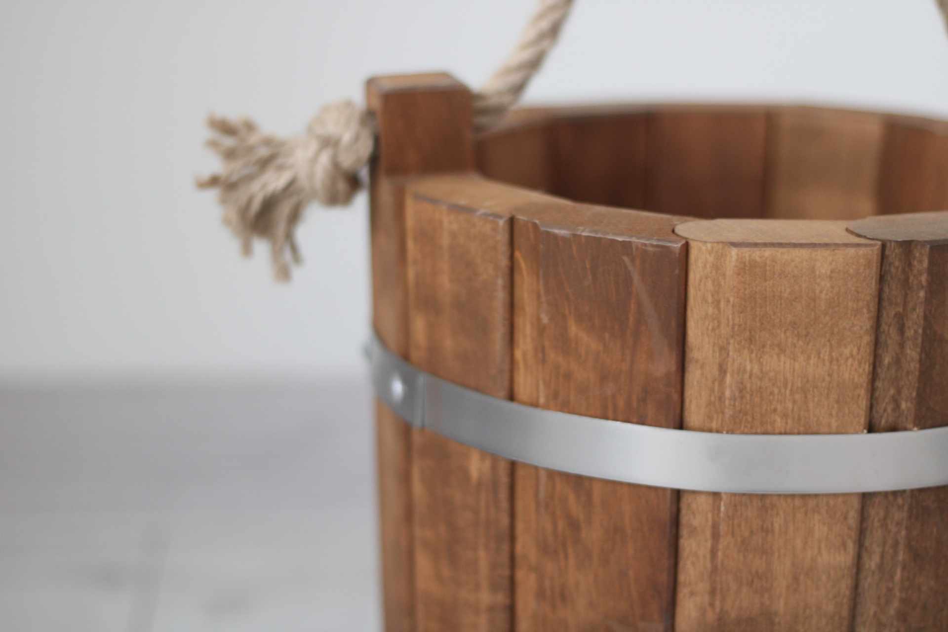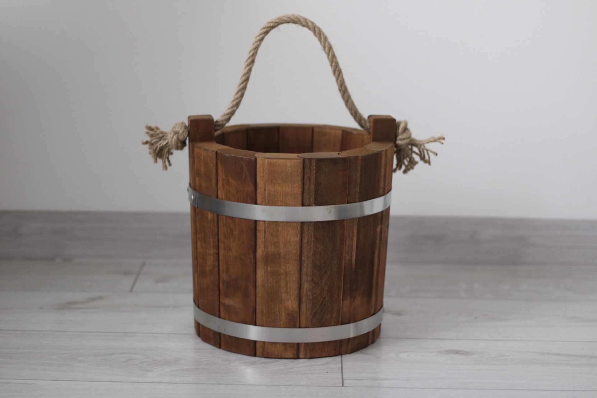 Drevené masívne vedro s lanom a kovaním morené - je vhodné ako dekorácia alebo môže poslúžiť aj na používanie. Rozmer: Objem: 8 L, Spodný priemer: 26 cm, Vrchný priemer: 28 cm, Výška: 28 cm Drevo Jelša Farba Dub
